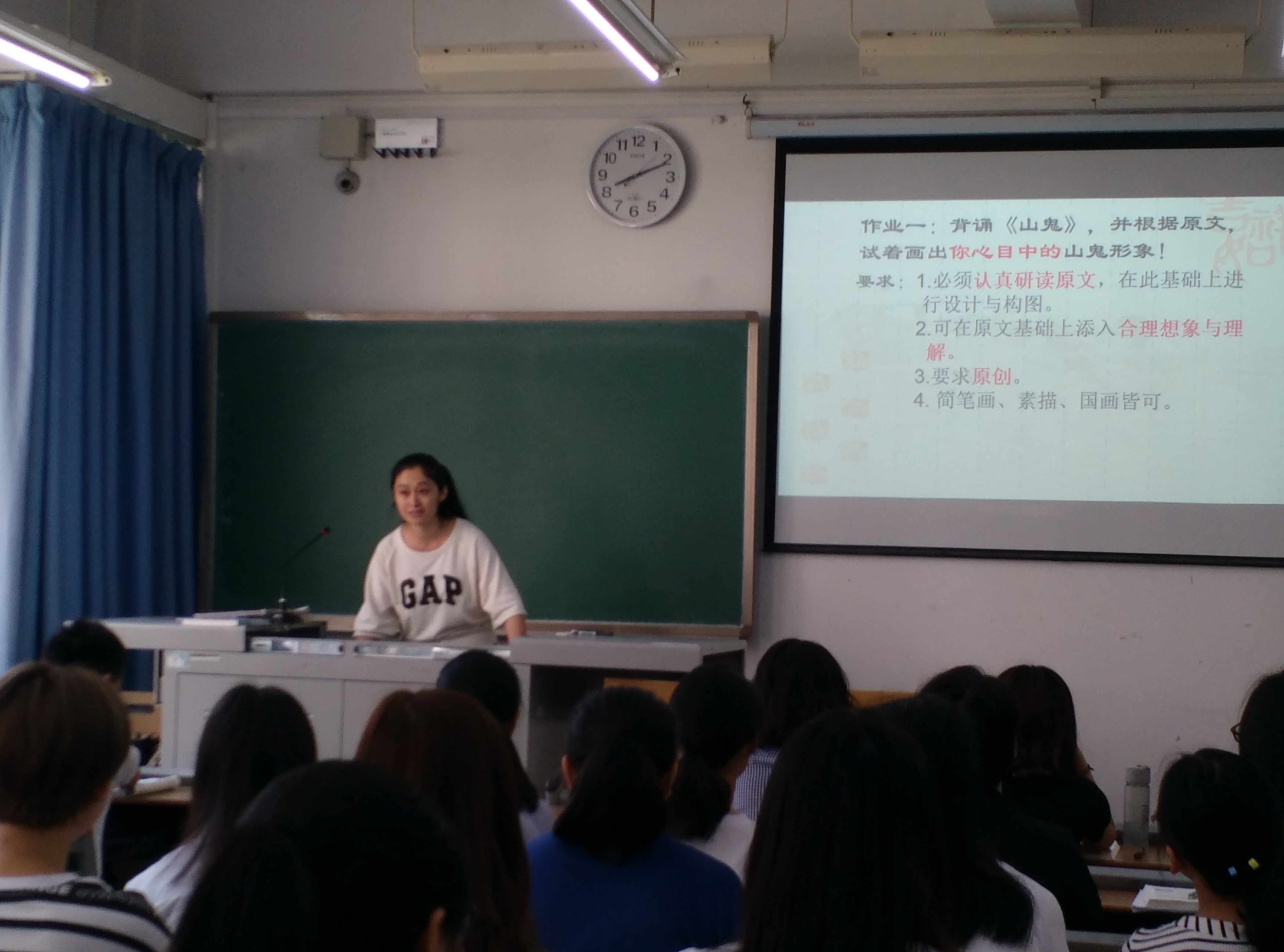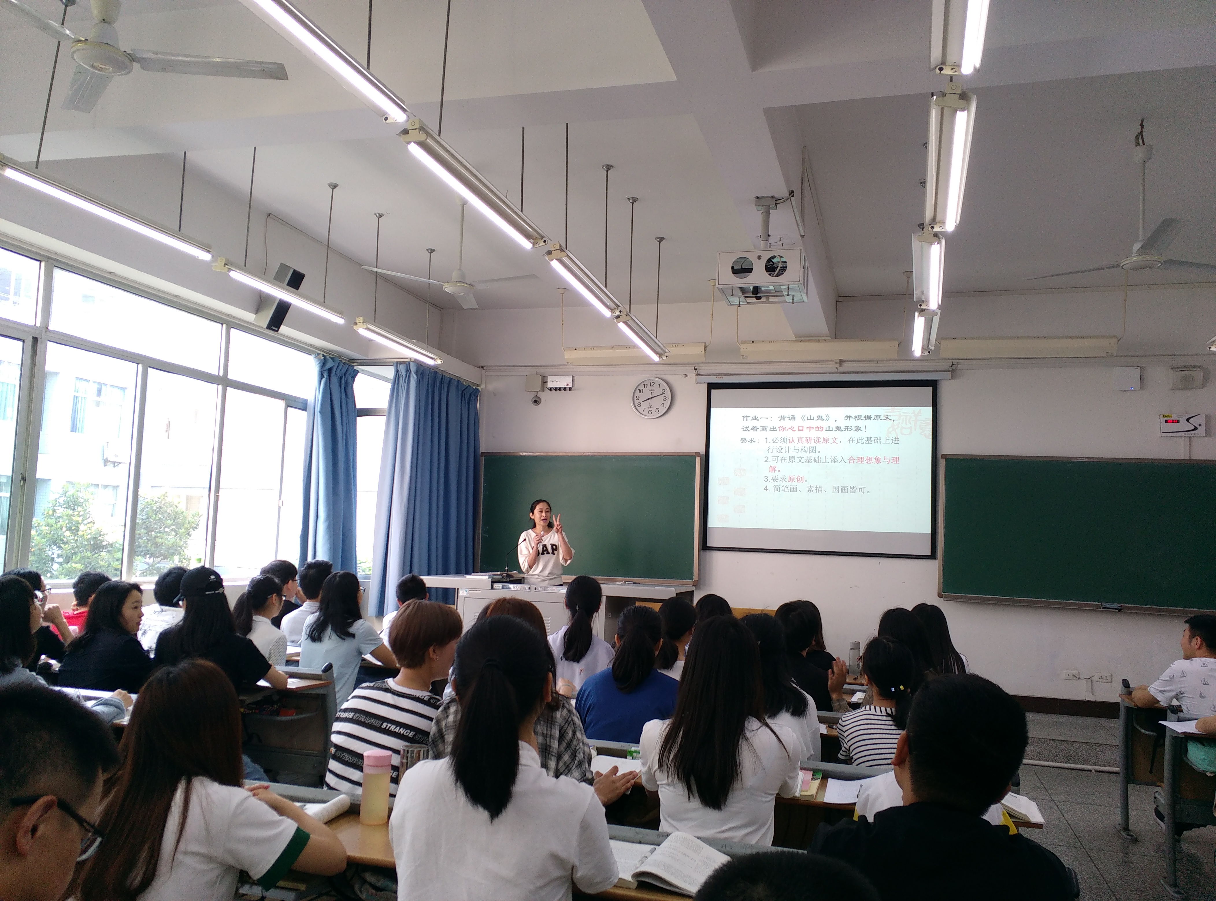 课上,李帅老师首先通过视频展示了学生根据屈原《山鬼》想象而设计绘制的图画作业,然后通过作业评点,自然导出包括“诗可以兴”、 “诗无达诂”等在文学鉴赏、文学批评中的一些文学理论,引导大家敢于有自己独立的思考,有“创造性的背离”。在讲解《琵琶行》一诗时,能够以白居易的生平经历,以及思想变化为背景,以唐代咏妓诗的发展变化为线索,分析这部作品的思想主题。最后李帅老师要求学生比较白居易与李白、李益相同题材的作品,借以提高学生对古代文学作品的分析研究能力。