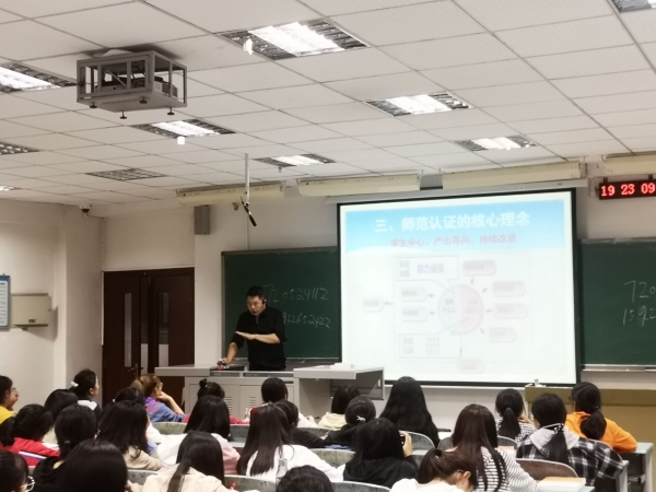 2019年10月10日晚7点,文化与传媒学院中文系主任黄贤忠博士在知津楼D404为2019级汉文师范专业学生举办一场旨在解读师范认证理念和2019人才培养方案的专题讲座。2019级汉语言文学师范专业的全体新生参与了这次学师范认证理论学习。